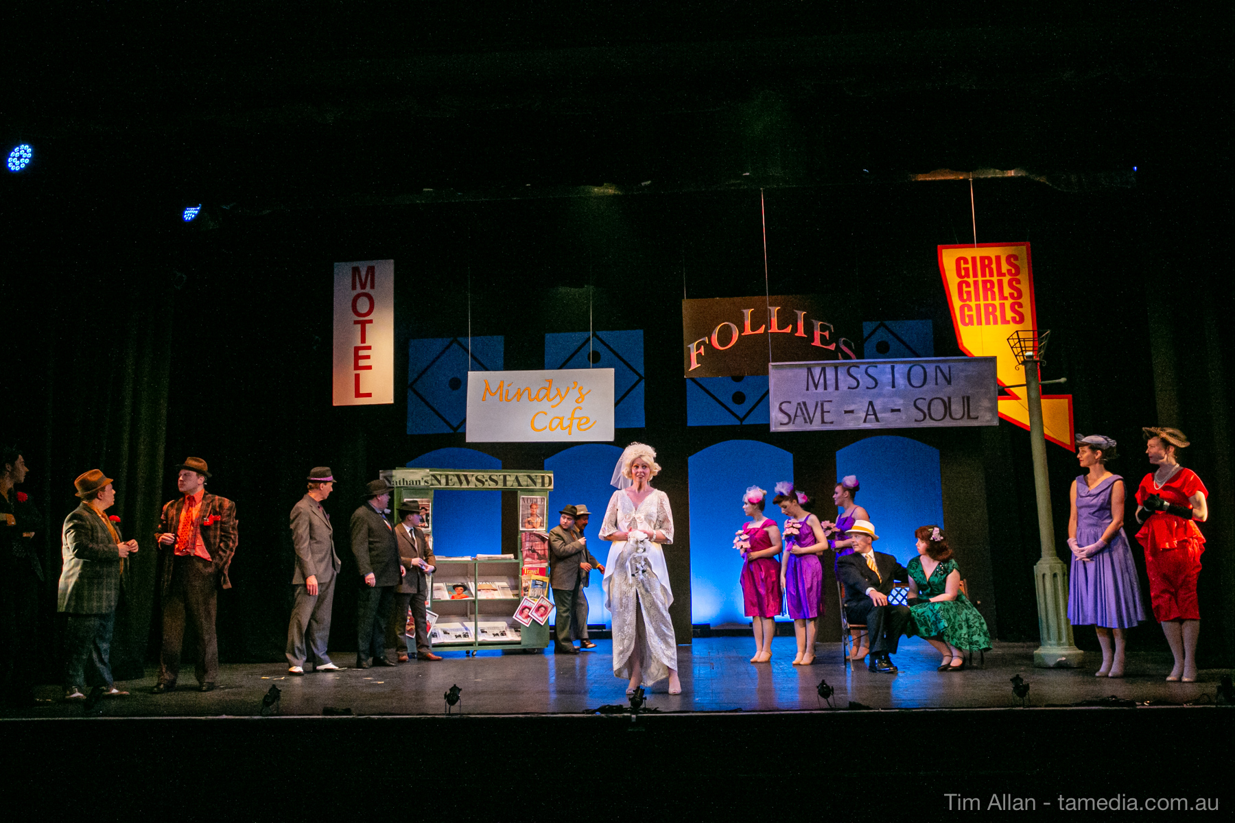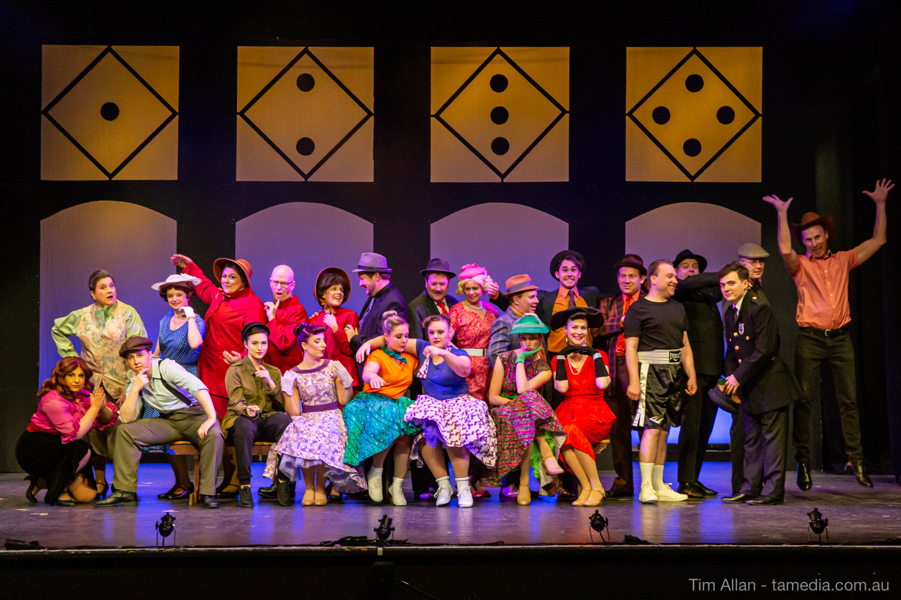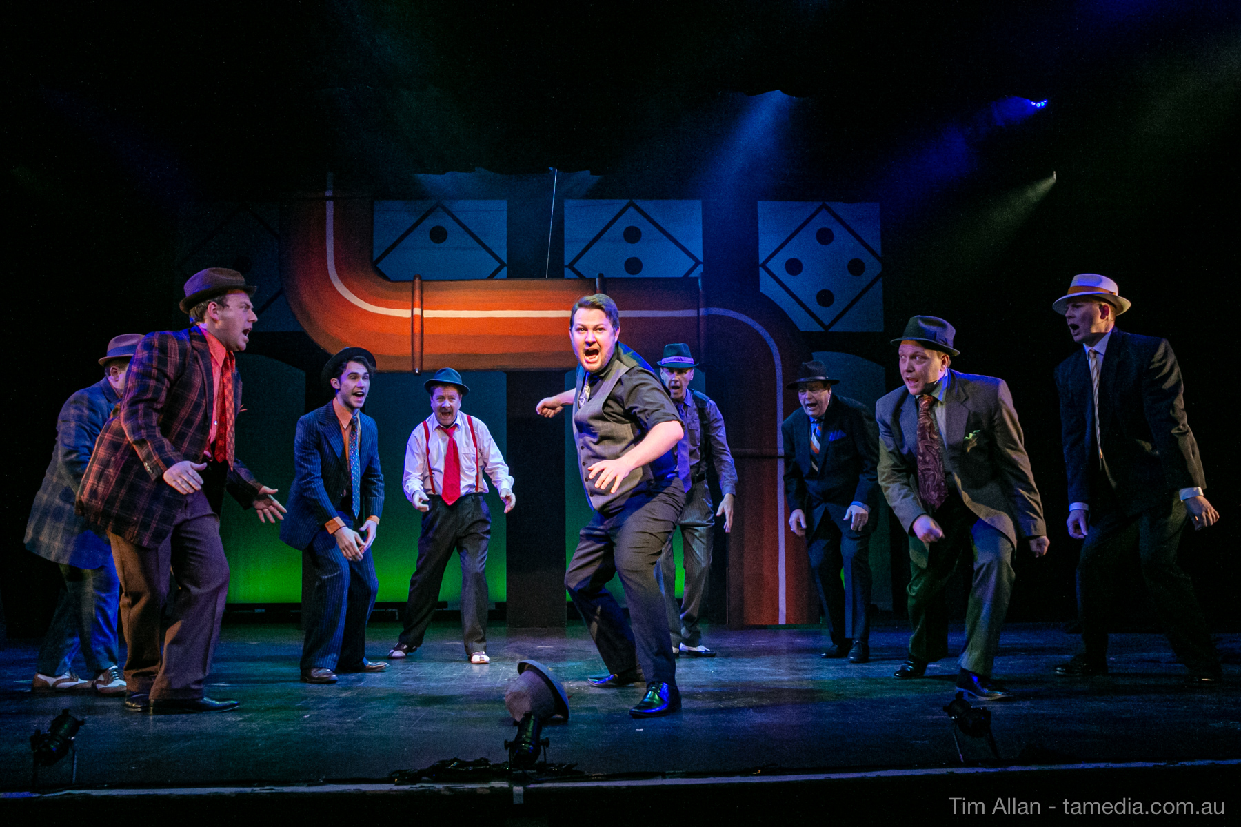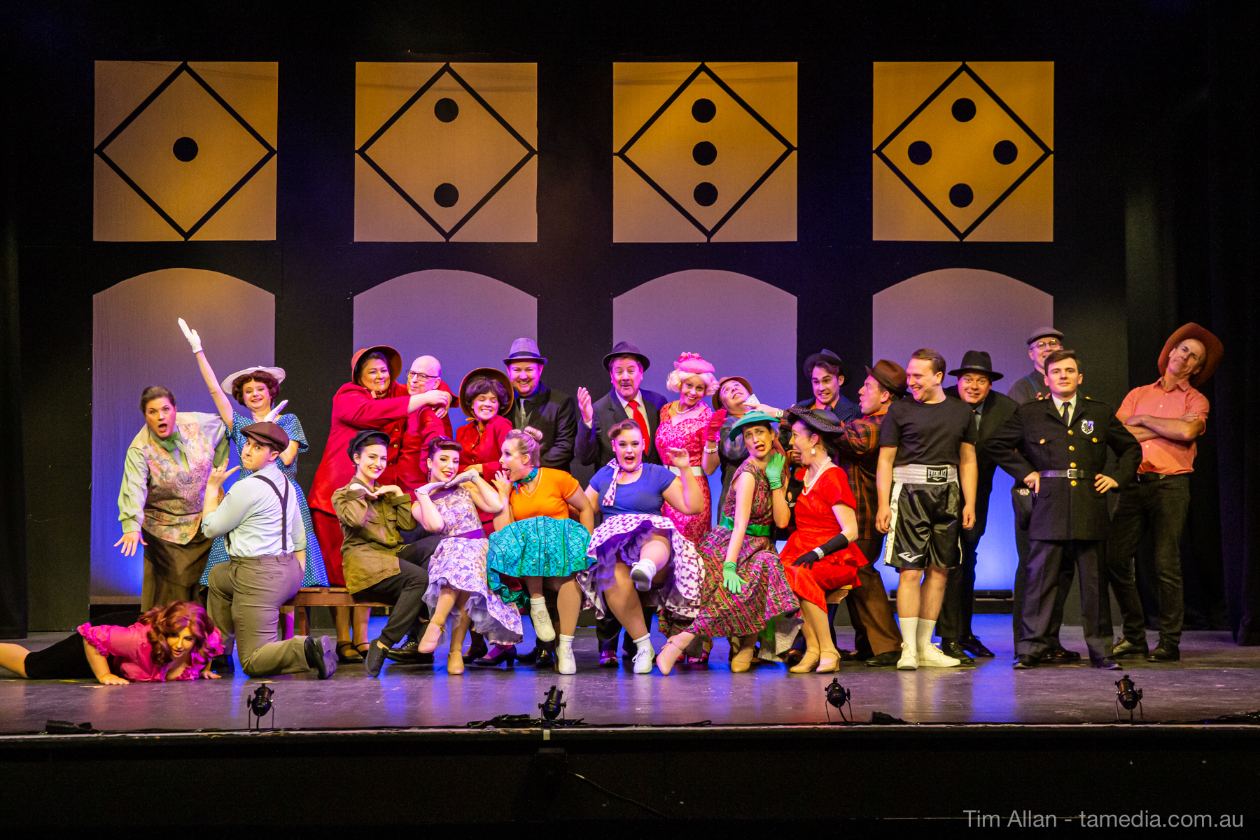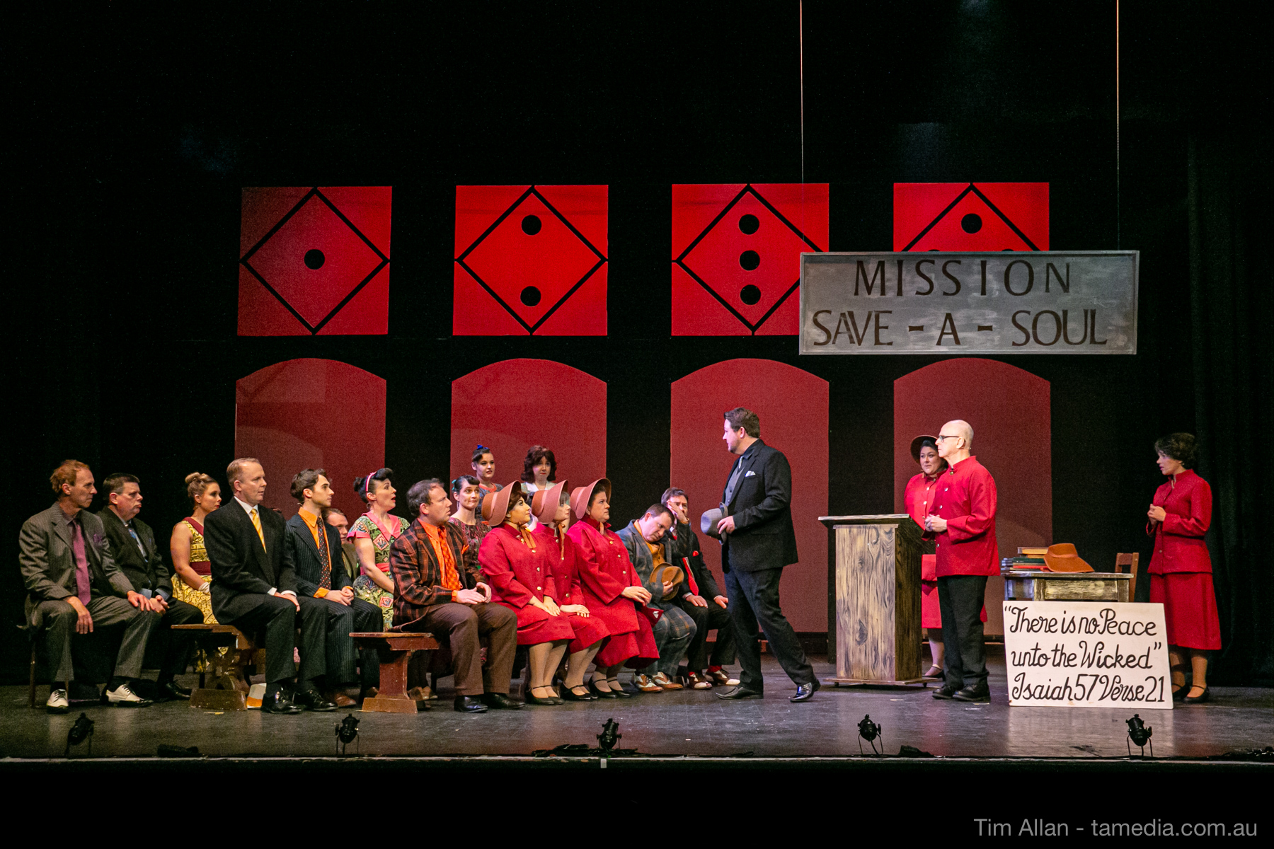 Set in the bustling Manhattan of Damon Runyon’s short stories, Guys and Dolls is a Depression era romantic comedy featuring crap games, horse races, gamblers, show girls and the evangelist members of a downtown Mission. Con-man Nathan Detroit is seeking a new location for his notorious ‘floating’ crap game, but he doesn’t have the dough he needs for a down payment. Enter Sky Masterson, a high-rolling gambler willing to take on any honest bet with a high enough reward attached. Nathan bets Sky that he can’t take the “doll”, of Nathan’s choosing, on a date to Havana, Cuba. When Sky agrees to the bet, Nathan chooses uptight Evangelist Sergeant Sarah Brown, head of Broadway’s Save-a-Soul Mission. Sky thinks he’s been duped, but he’s in for even more of a surprise when his efforts to woo Sarah are so successful that he falls in love with her himself! Meanwhile Nathan is under pressure from his long time ‘fiancee’ and night club dancer, Miss Adelaide, to settle down and get married. What are the odds?