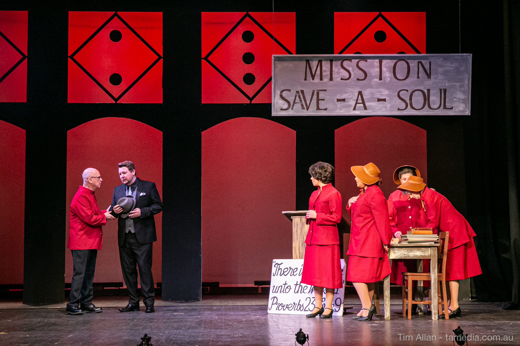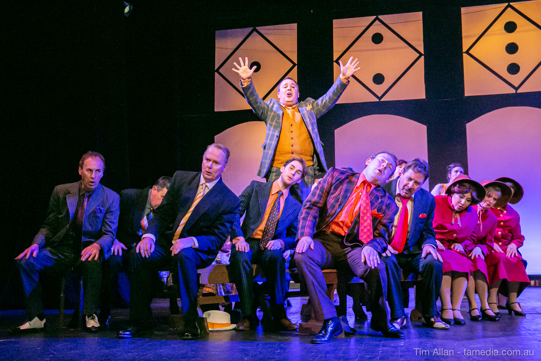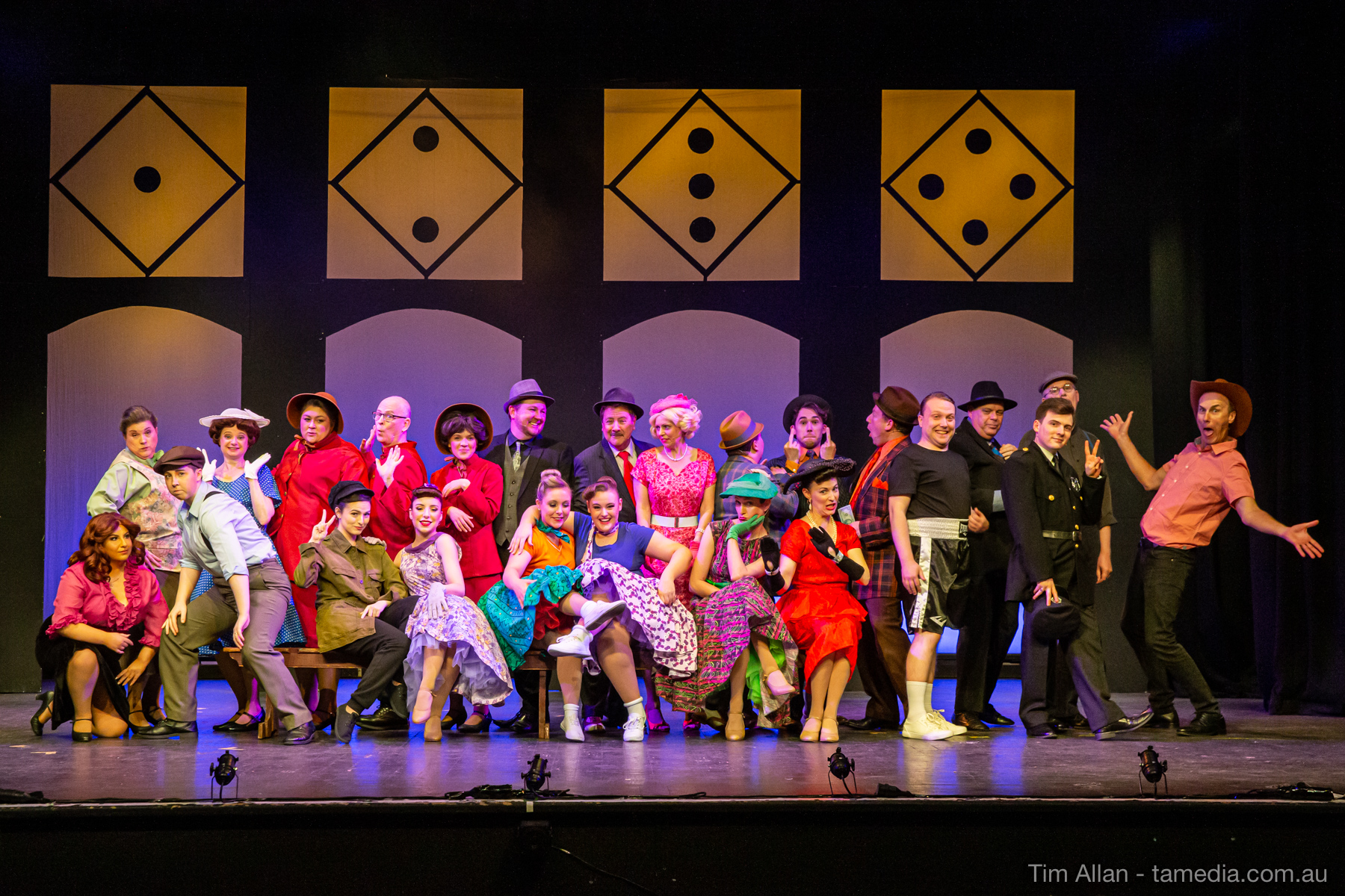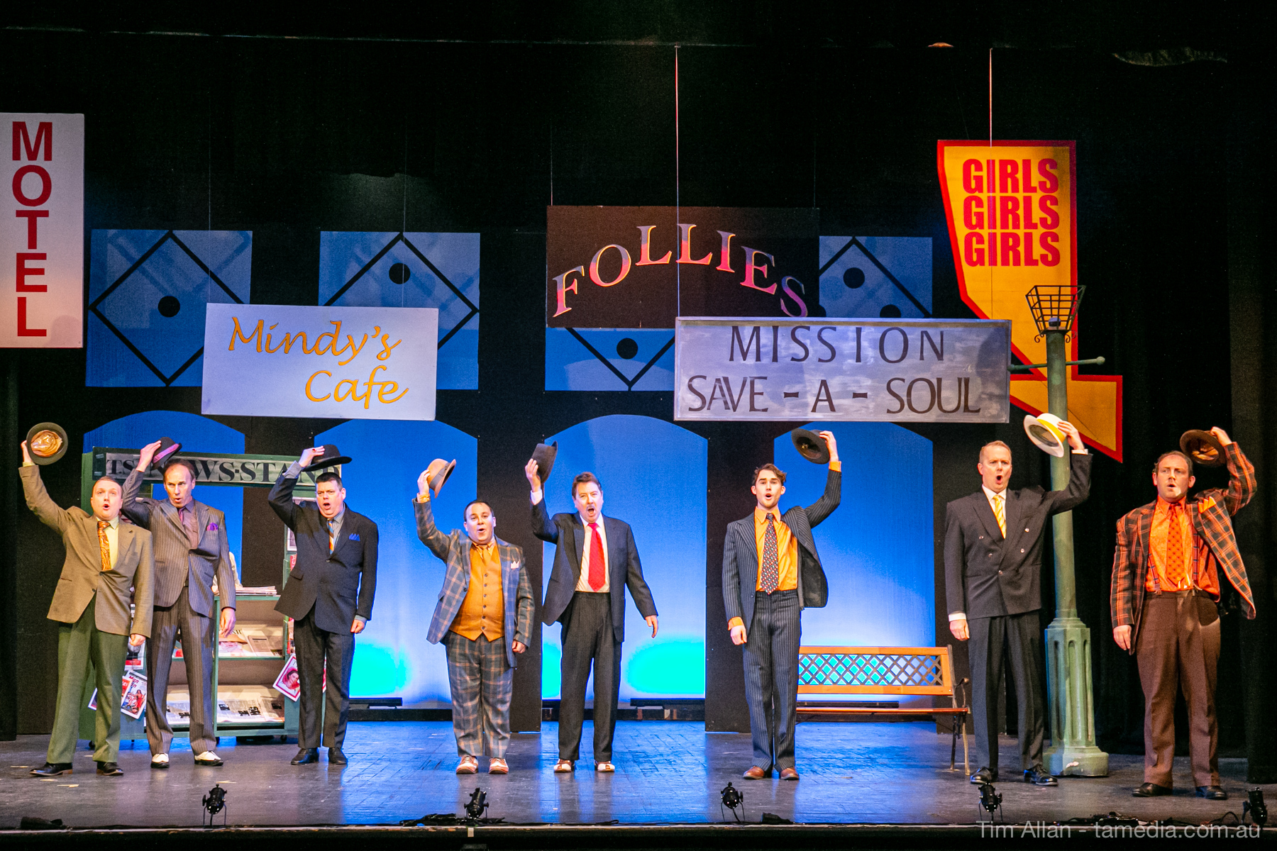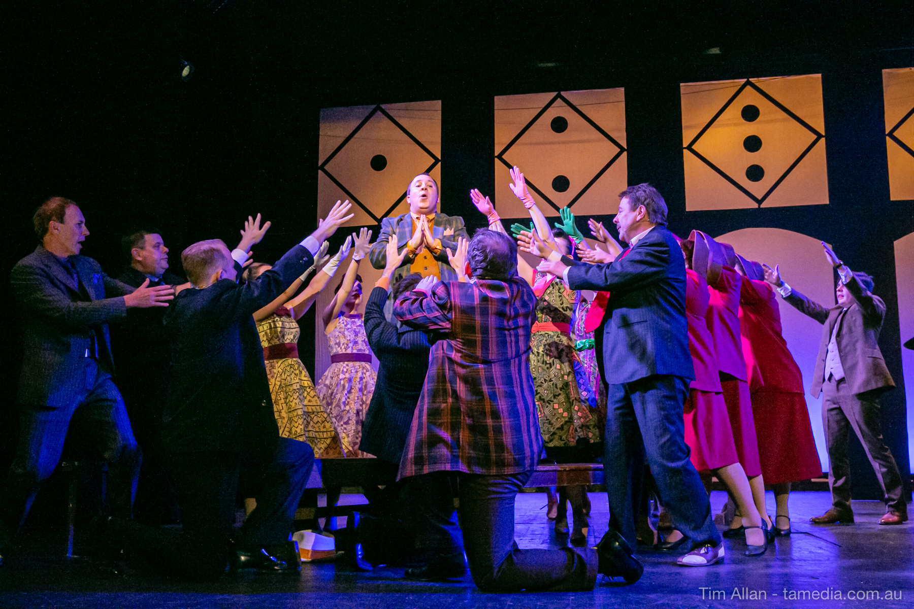 Set in the bustling Manhattan of Damon Runyon’s short stories, Guys and Dolls is a Depression era romantic comedy featuring crap games, horse races, gamblers, show girls and the evangelist members of a downtown Mission. Con-man Nathan Detroit is seeking a new location for his notorious ‘floating’ crap game, but he doesn’t have the dough he needs for a down payment. Enter Sky Masterson, a high-rolling gambler willing to take on any honest bet with a high enough reward attached. Nathan bets Sky that he can’t take the “doll”, of Nathan’s choosing, on a date to Havana, Cuba. When Sky agrees to the bet, Nathan chooses uptight Evangelist Sergeant Sarah Brown, head of Broadway’s Save-a-Soul Mission. Sky thinks he’s been duped, but he’s in for even more of a surprise when his efforts to woo Sarah are so successful that he falls in love with her himself! Meanwhile Nathan is under pressure from his long time ‘fiancee’ and night club dancer, Miss Adelaide, to settle down and get married. What are the odds?