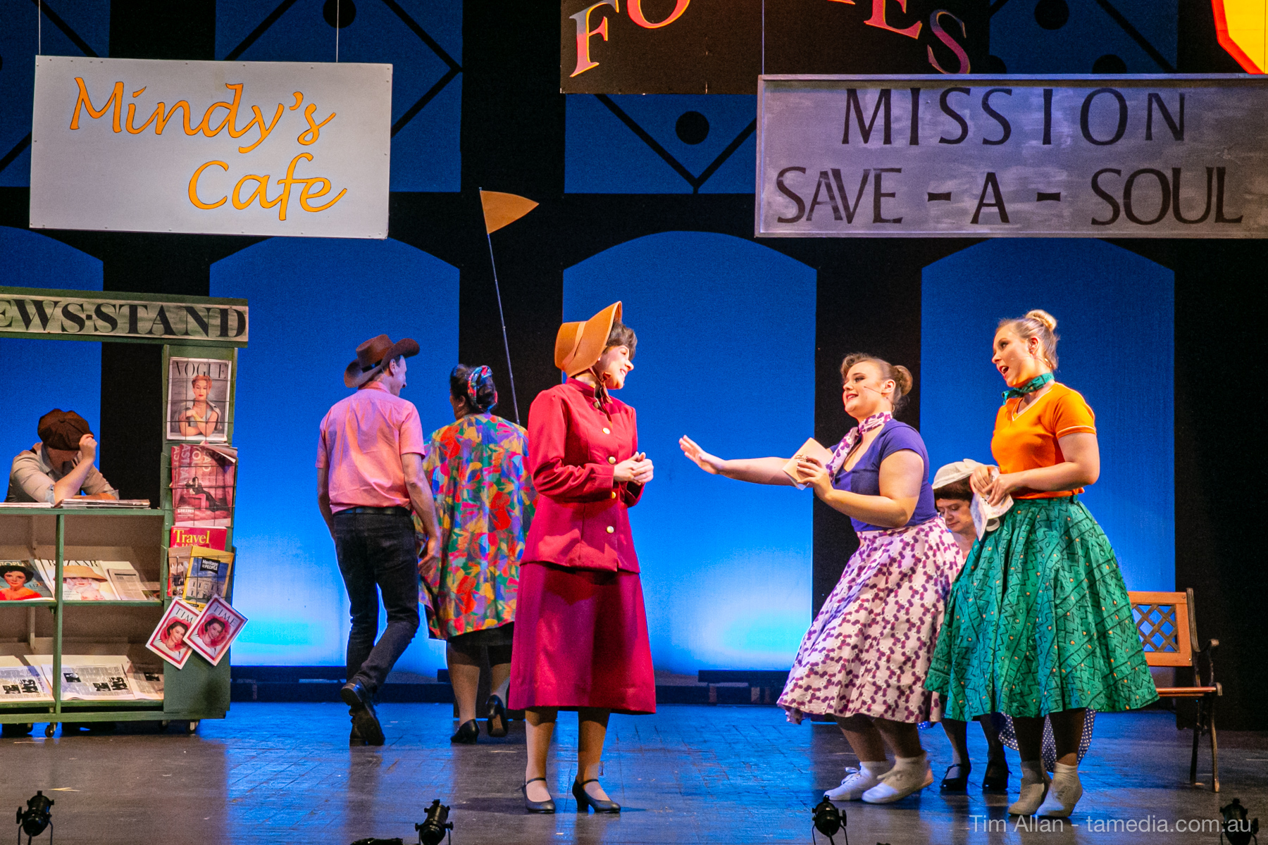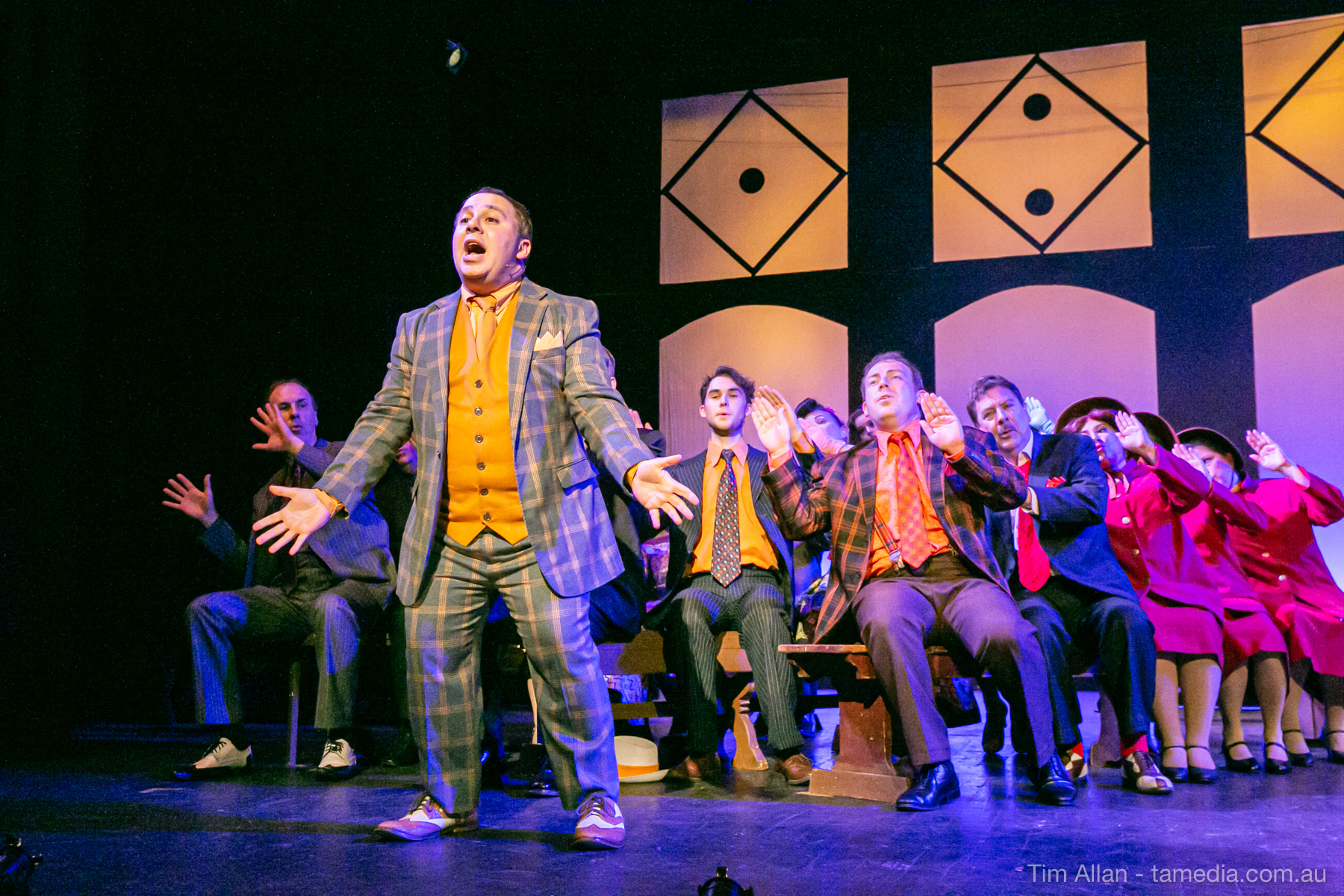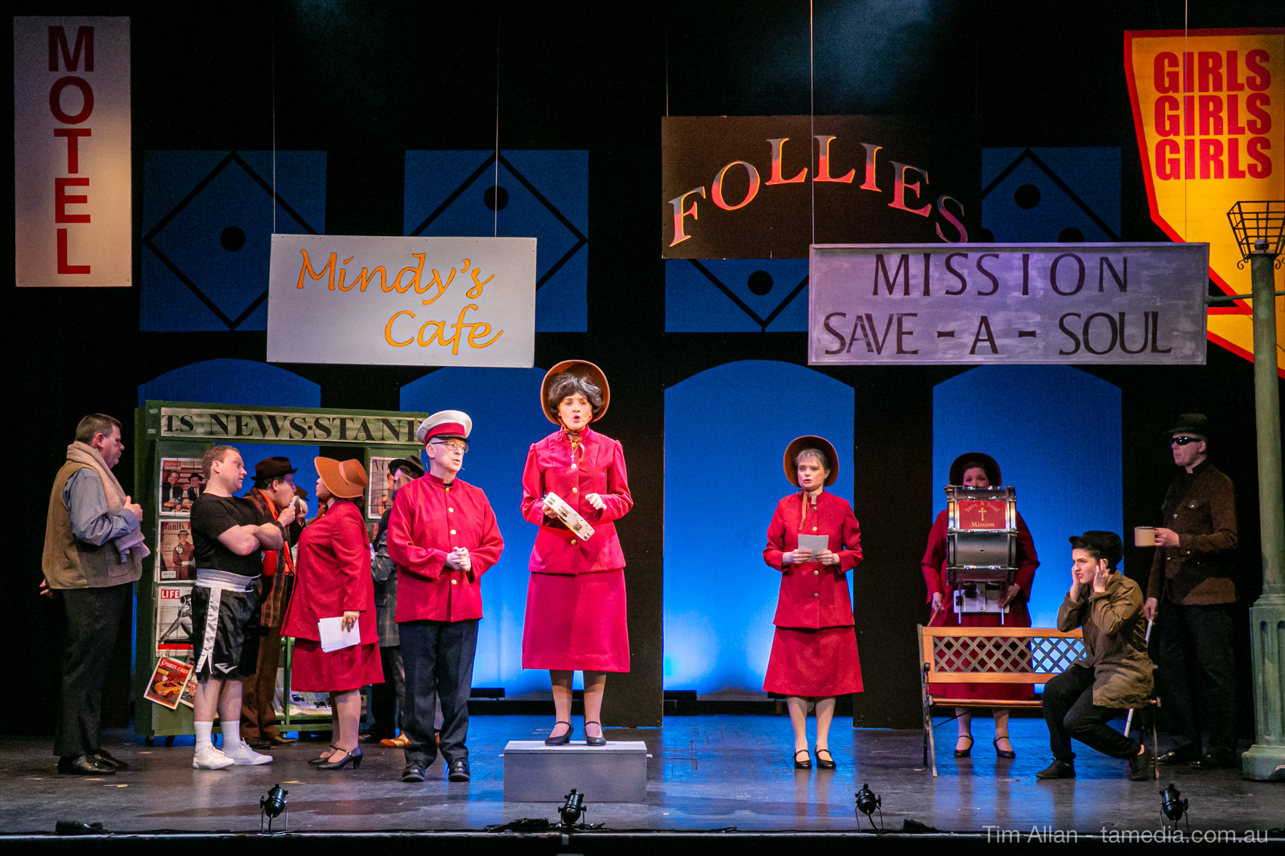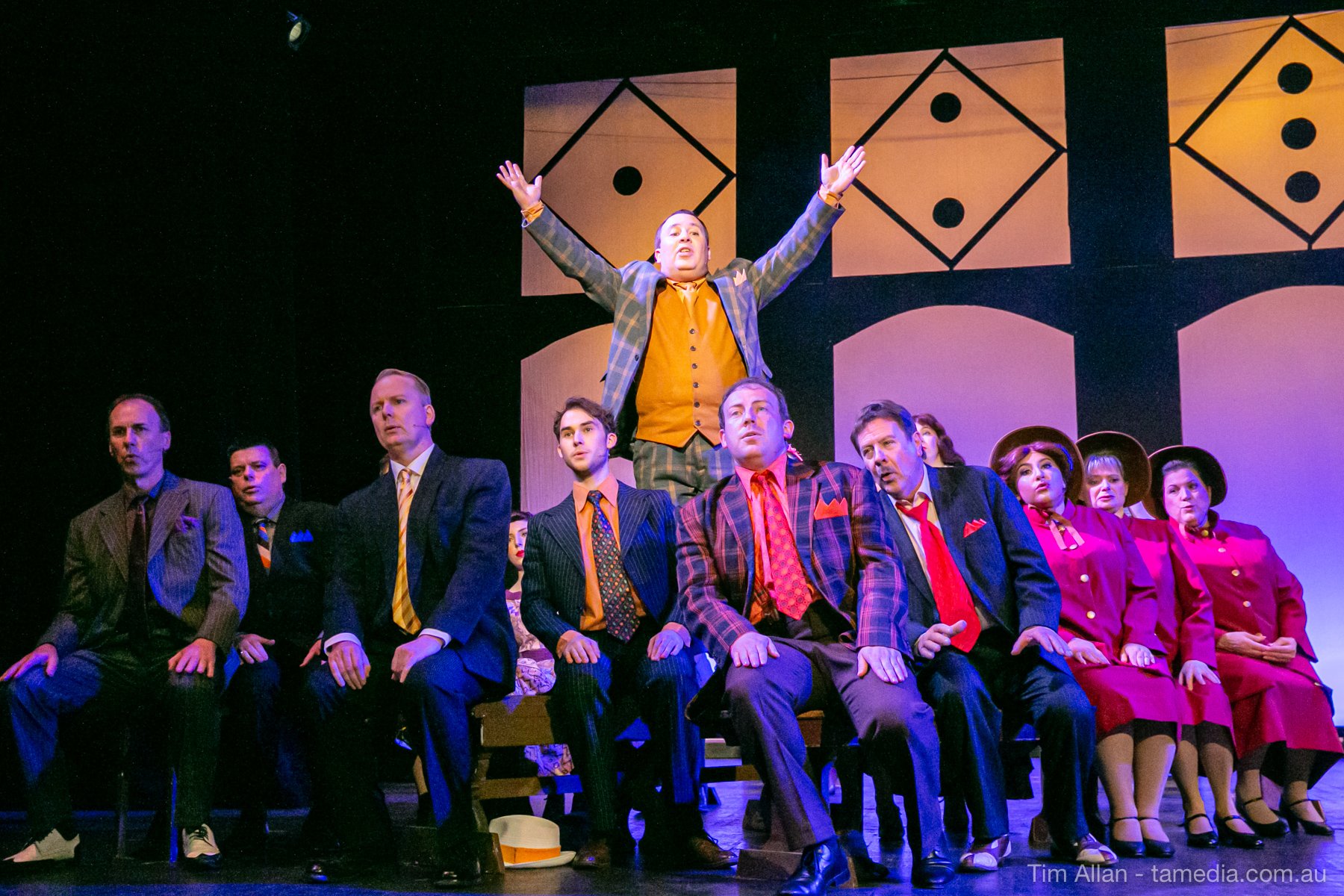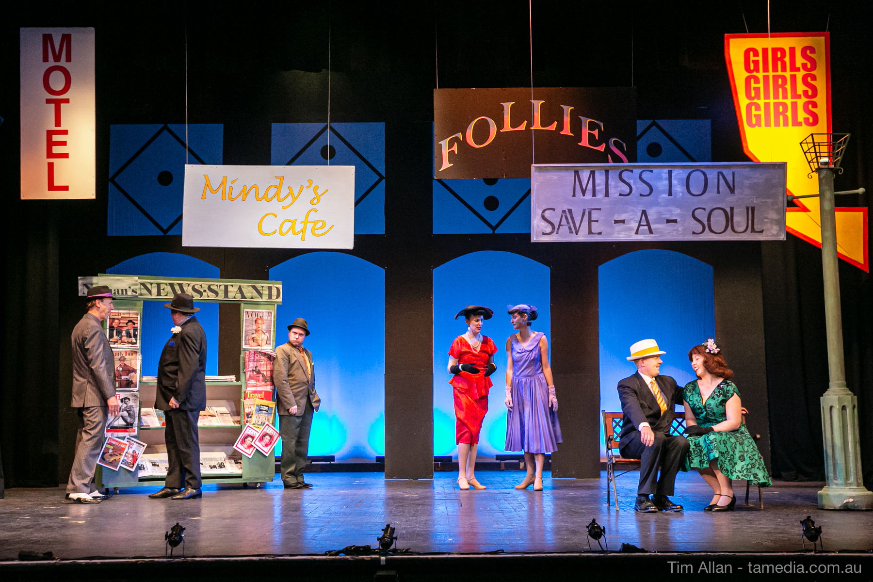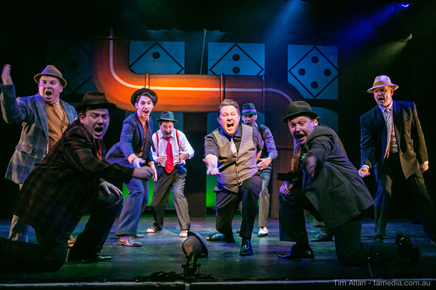 Set in the bustling Manhattan of Damon Runyon’s short stories, Guys and Dolls is a Depression era romantic comedy featuring crap games, horse races, gamblers, show girls and the evangelist members of a downtown Mission. Con-man Nathan Detroit is seeking a new location for his notorious ‘floating’ crap game, but he doesn’t have the dough he needs for a down payment. Enter Sky Masterson, a high-rolling gambler willing to take on any honest bet with a high enough reward attached. Nathan bets Sky that he can’t take the “doll”, of Nathan’s choosing, on a date to Havana, Cuba. When Sky agrees to the bet, Nathan chooses uptight Evangelist Sergeant Sarah Brown, head of Broadway’s Save-a-Soul Mission. Sky thinks he’s been duped, but he’s in for even more of a surprise when his efforts to woo Sarah are so successful that he falls in love with her himself! Meanwhile Nathan is under pressure from his long time ‘fiancee’ and night club dancer, Miss Adelaide, to settle down and get married. What are the odds?