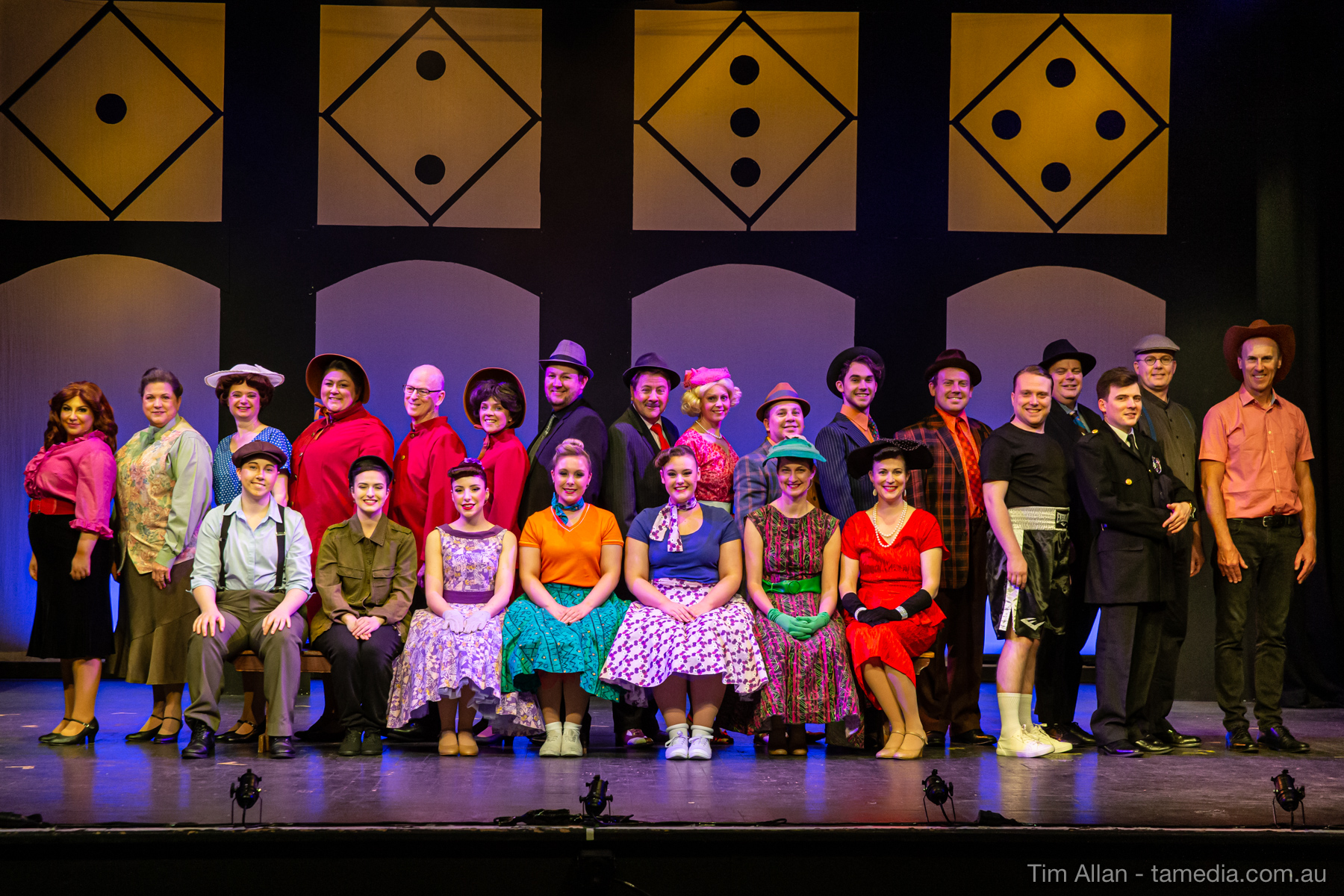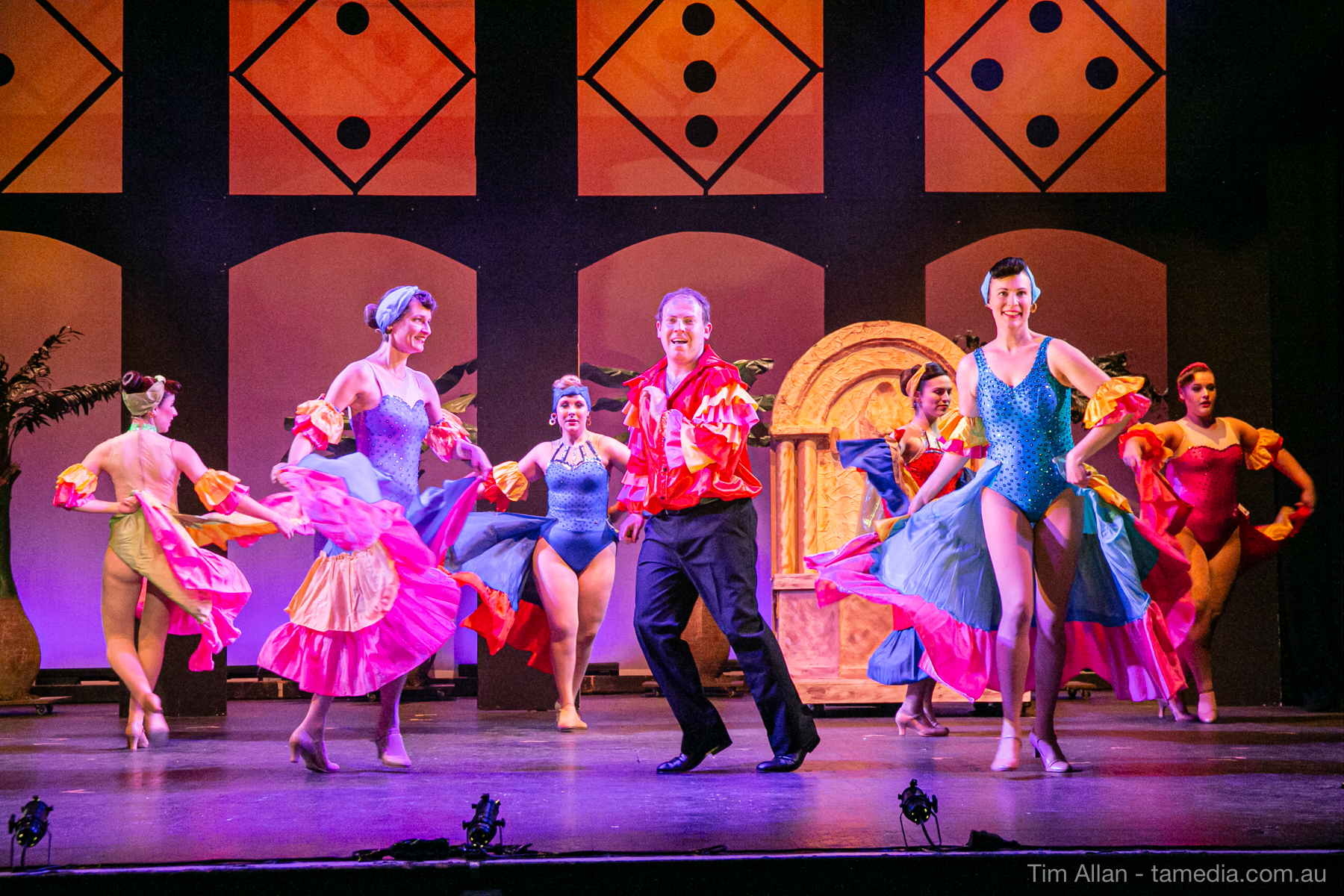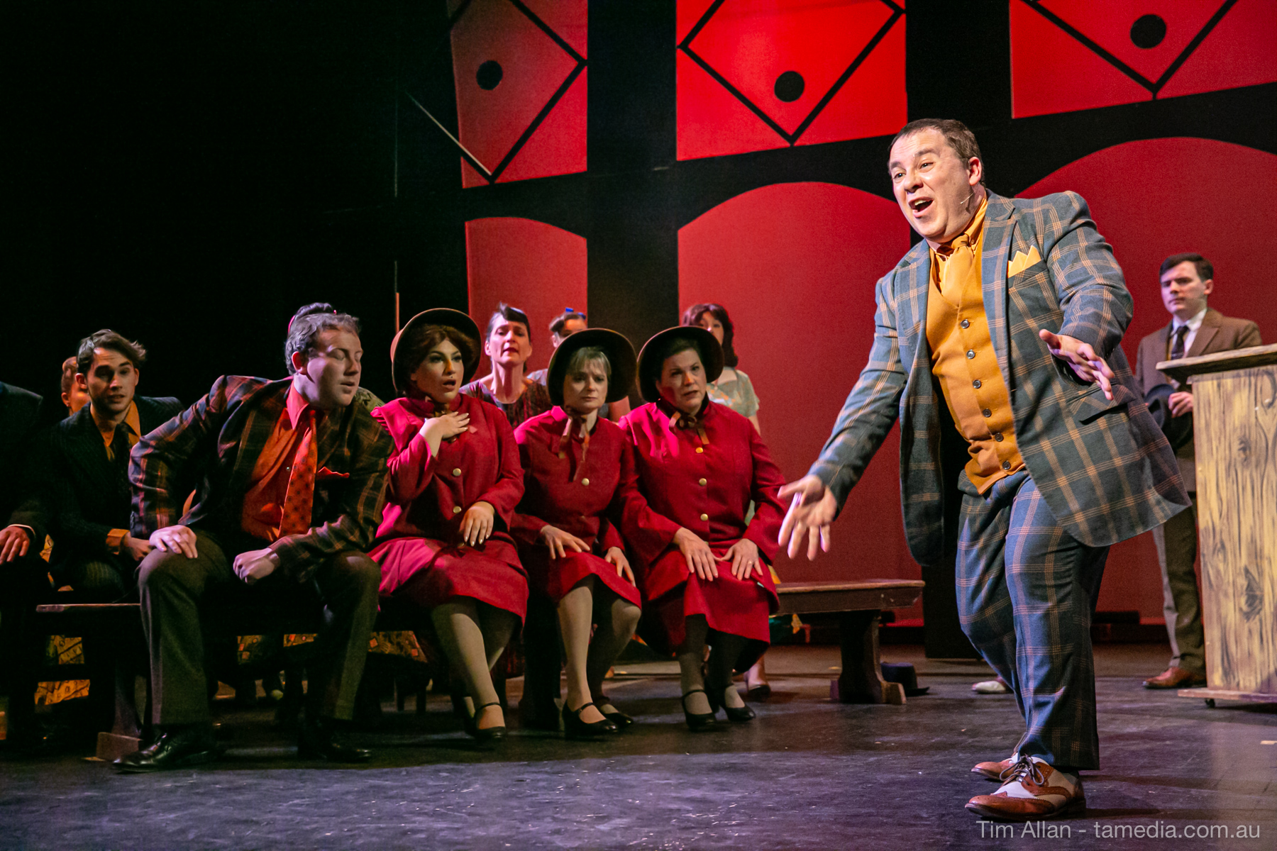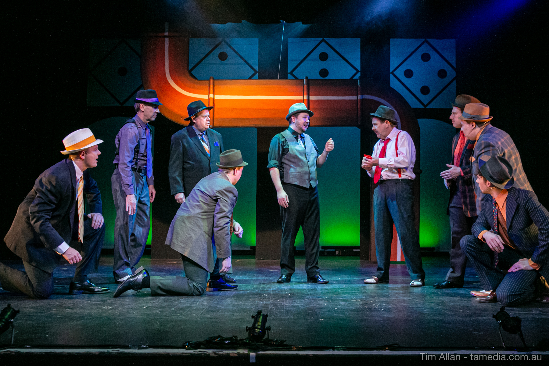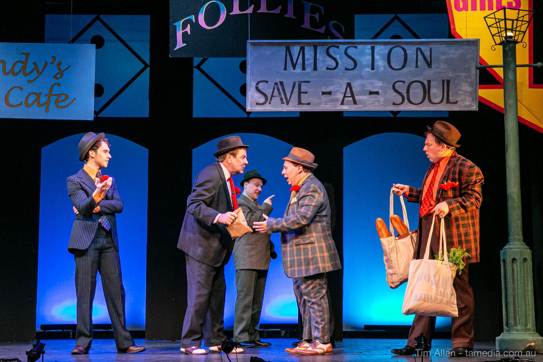 Set in the bustling Manhattan of Damon Runyon’s short stories, Guys and Dolls is a Depression era romantic comedy featuring crap games, horse races, gamblers, show girls and the evangelist members of a downtown Mission. Con-man Nathan Detroit is seeking a new location for his notorious ‘floating’ crap game, but he doesn’t have the dough he needs for a down payment. Enter Sky Masterson, a high-rolling gambler willing to take on any honest bet with a high enough reward attached. Nathan bets Sky that he can’t take the “doll”, of Nathan’s choosing, on a date to Havana, Cuba. When Sky agrees to the bet, Nathan chooses uptight Evangelist Sergeant Sarah Brown, head of Broadway’s Save-a-Soul Mission. Sky thinks he’s been duped, but he’s in for even more of a surprise when his efforts to woo Sarah are so successful that he falls in love with her himself! Meanwhile Nathan is under pressure from his long time ‘fiancee’ and night club dancer, Miss Adelaide, to settle down and get married. What are the odds?
