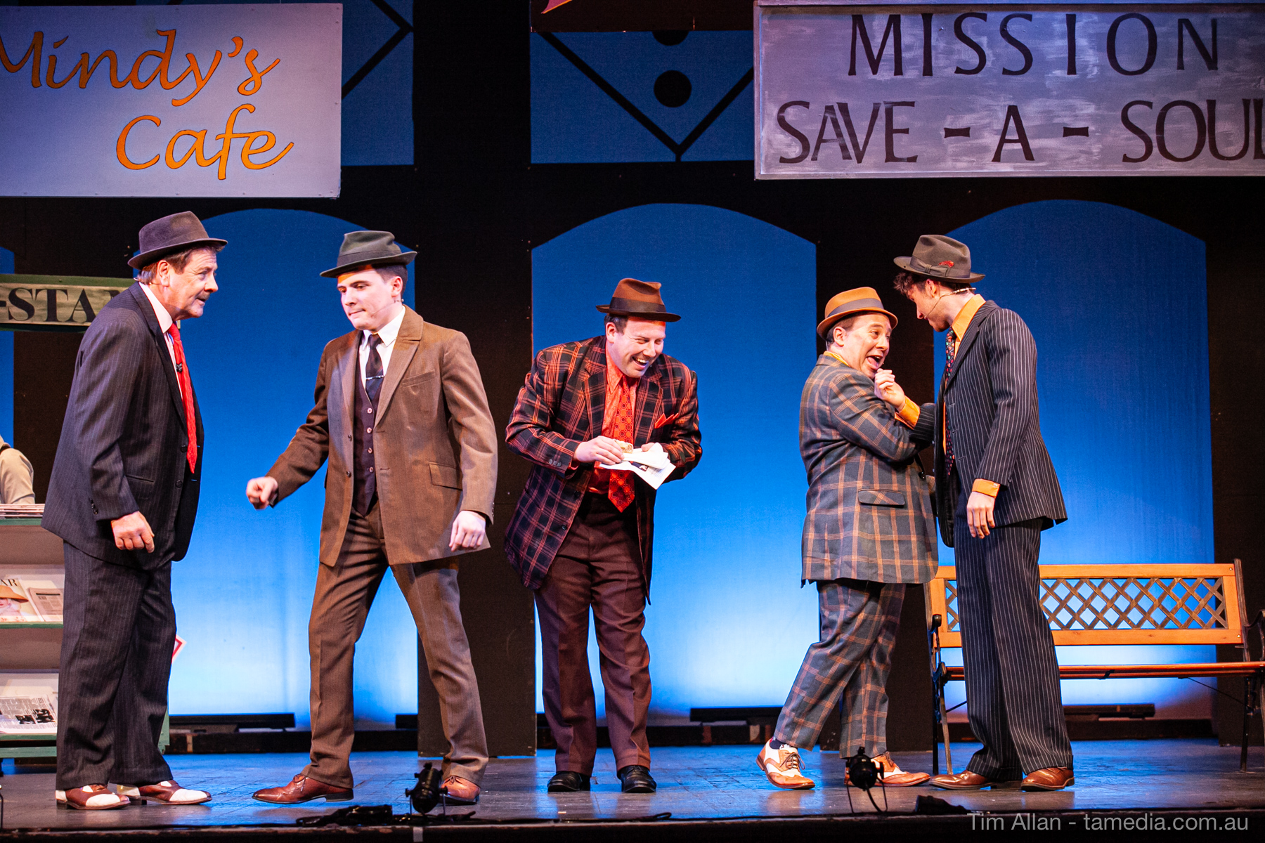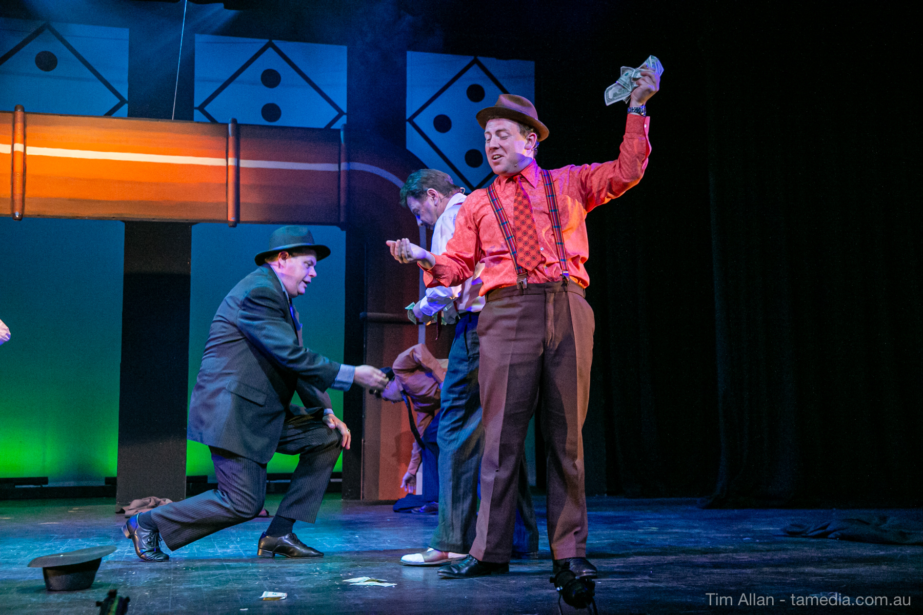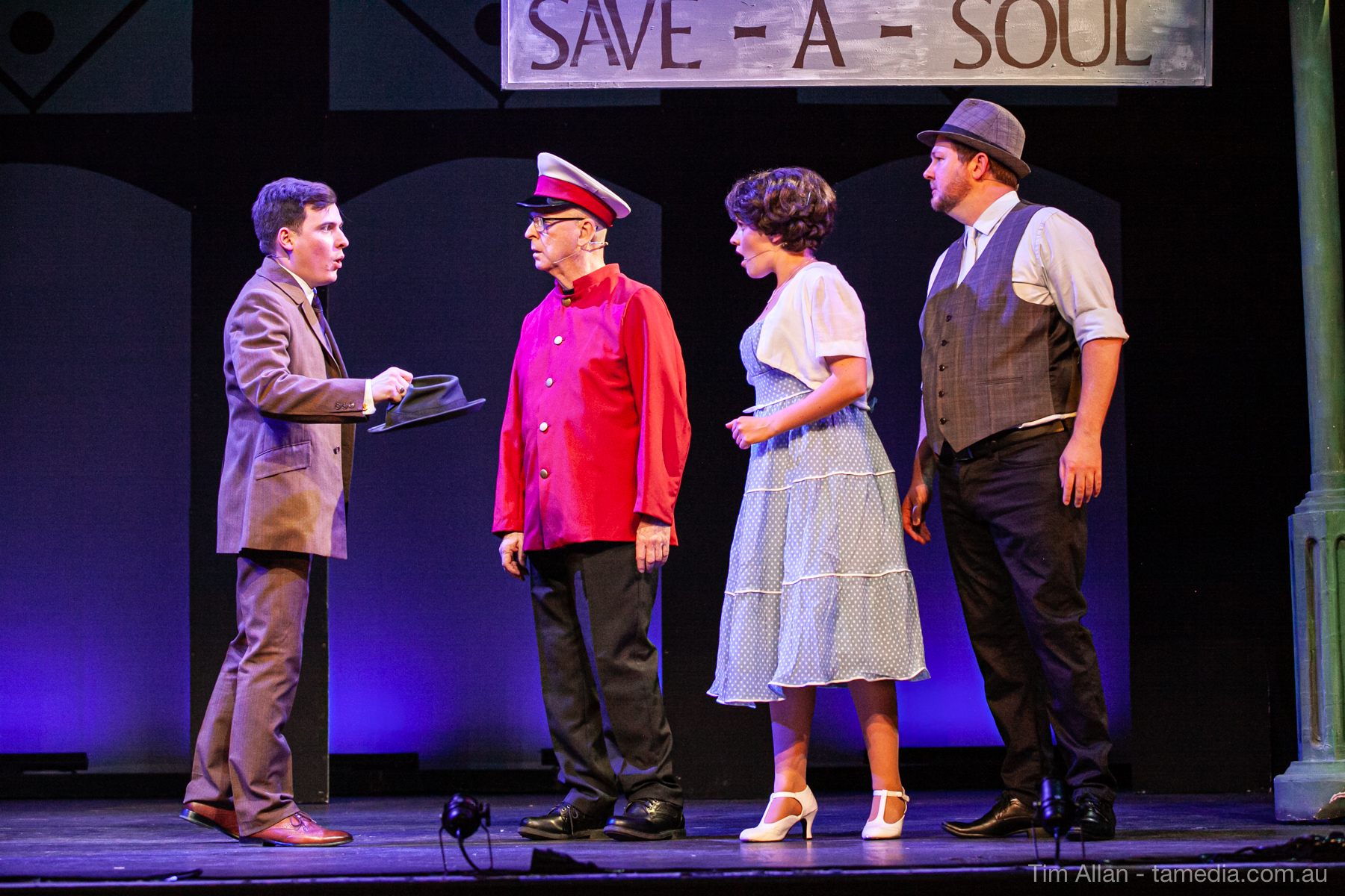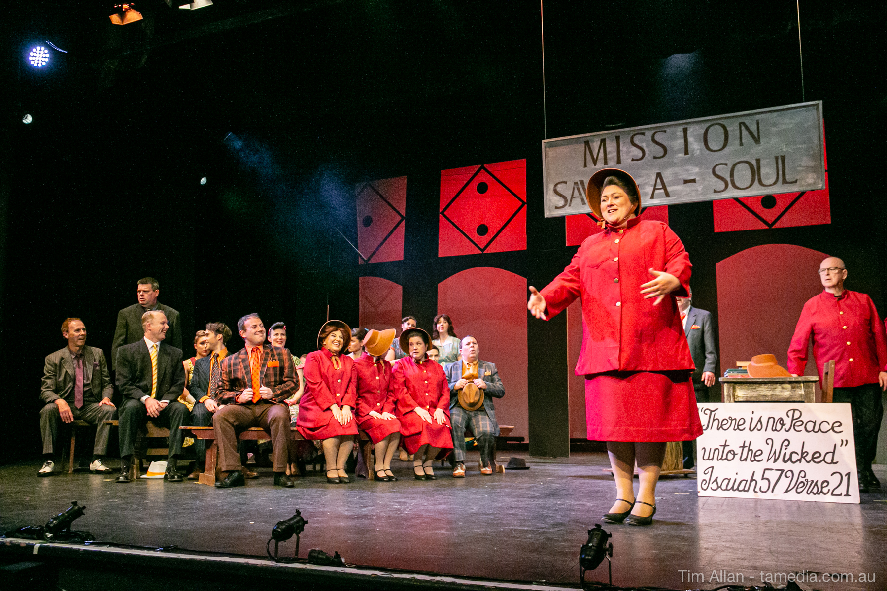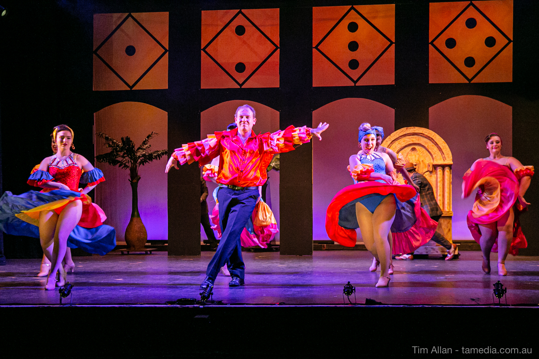 Set in the bustling Manhattan of Damon Runyon’s short stories, Guys and Dolls is a Depression era romantic comedy featuring crap games, horse races, gamblers, show girls and the evangelist members of a downtown Mission. Con-man Nathan Detroit is seeking a new location for his notorious ‘floating’ crap game, but he doesn’t have the dough he needs for a down payment. Enter Sky Masterson, a high-rolling gambler willing to take on any honest bet with a high enough reward attached. Nathan bets Sky that he can’t take the “doll”, of Nathan’s choosing, on a date to Havana, Cuba. When Sky agrees to the bet, Nathan chooses uptight Evangelist Sergeant Sarah Brown, head of Broadway’s Save-a-Soul Mission. Sky thinks he’s been duped, but he’s in for even more of a surprise when his efforts to woo Sarah are so successful that he falls in love with her himself! Meanwhile Nathan is under pressure from his long time ‘fiancee’ and night club dancer, Miss Adelaide, to settle down and get married. What are the odds?