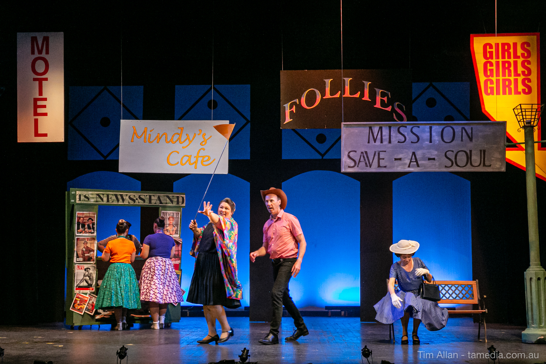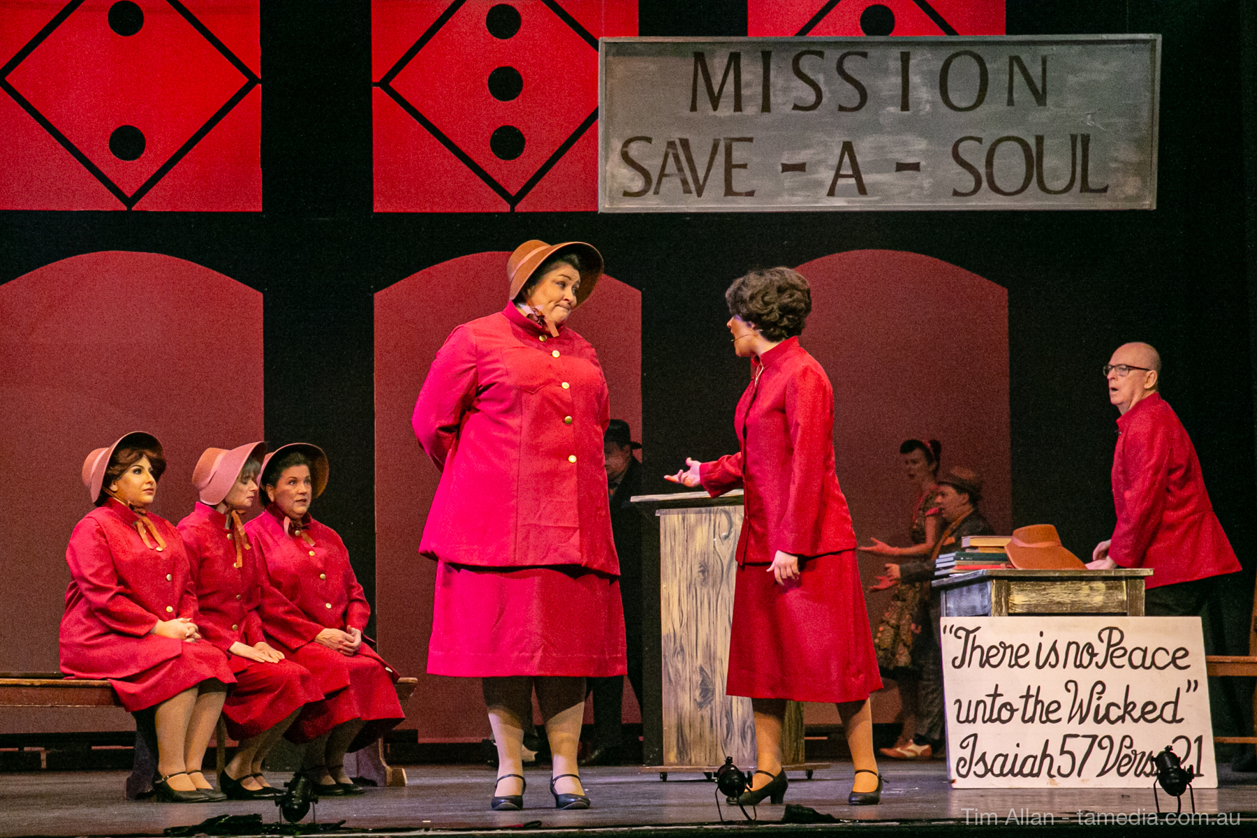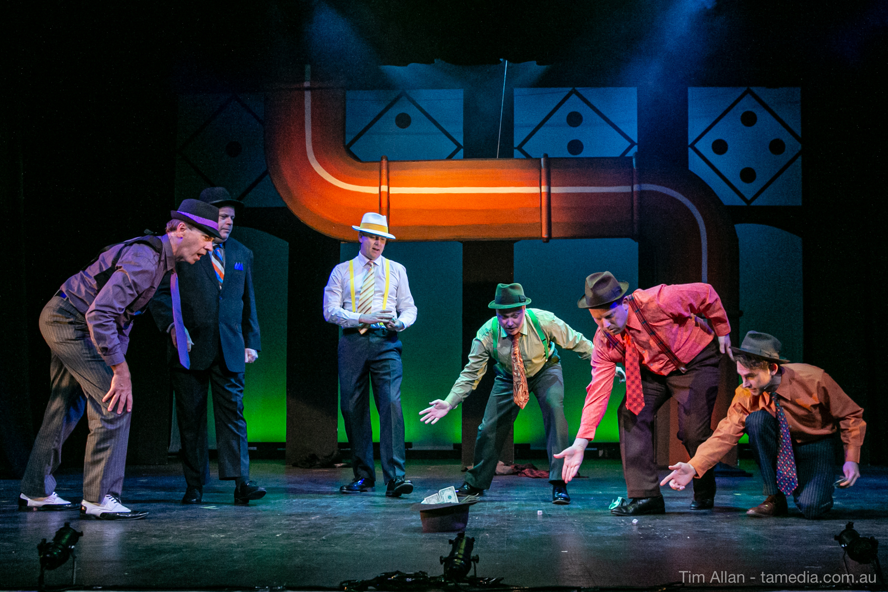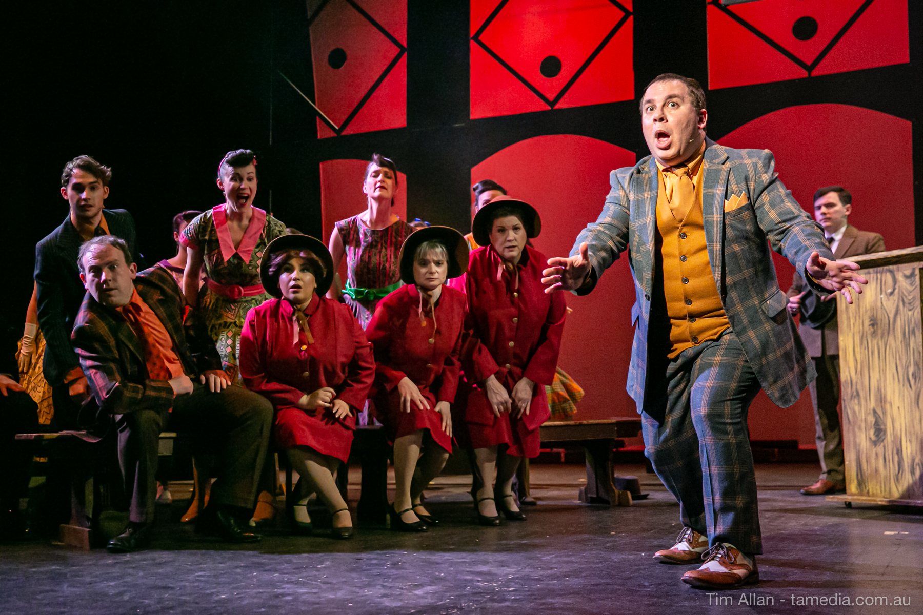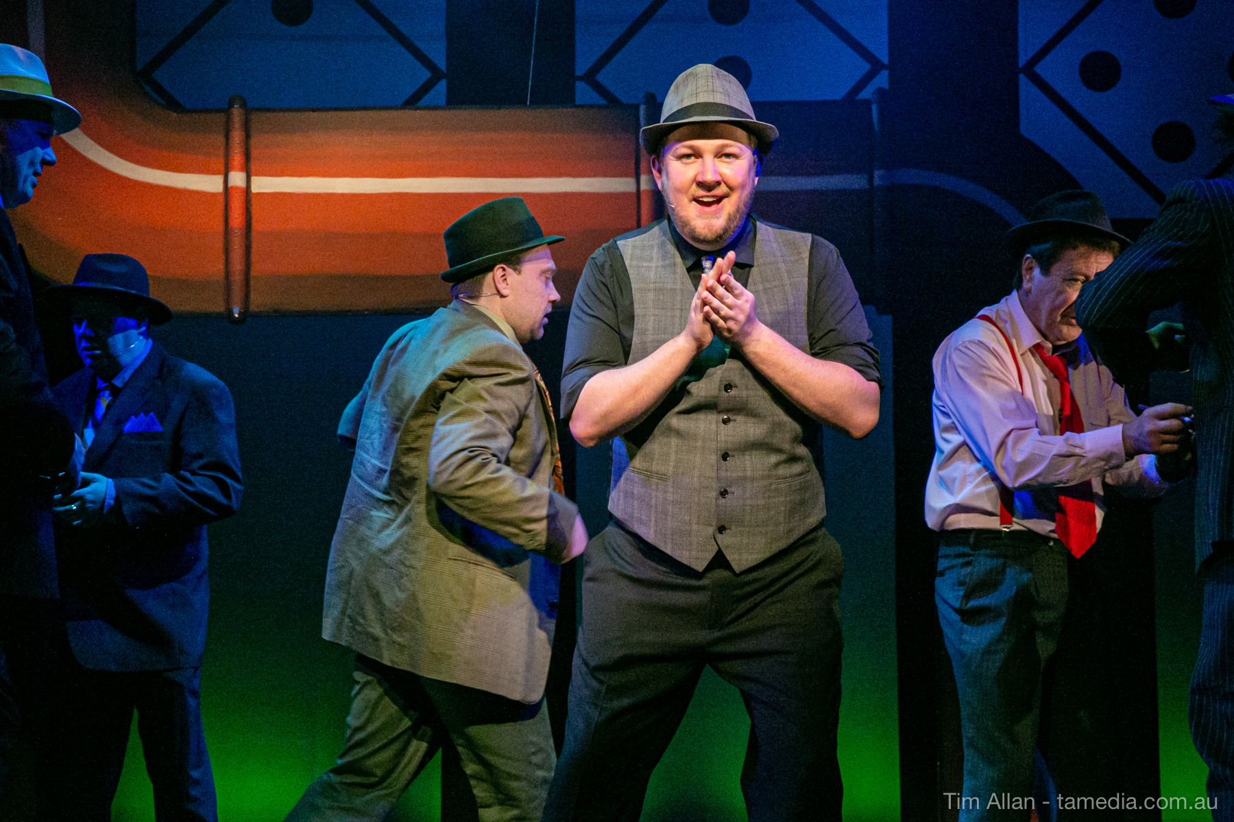Set in the bustling Manhattan of Damon Runyon’s short stories, Guys and Dolls is a Depression era romantic comedy featuring crap games, horse races, gamblers, show girls and the evangelist members of a downtown Mission. Con-man Nathan Detroit is seeking a new location for his notorious ‘floating’ crap game, but he doesn’t have the dough he needs for a down payment. Enter Sky Masterson, a high-rolling gambler willing to take on any honest bet with a high enough reward attached. Nathan bets Sky that he can’t take the “doll”, of Nathan’s choosing, on a date to Havana, Cuba. When Sky agrees to the bet, Nathan chooses uptight Evangelist Sergeant Sarah Brown, head of Broadway’s Save-a-Soul Mission. Sky thinks he’s been duped, but he’s in for even more of a surprise when his efforts to woo Sarah are so successful that he falls in love with her himself! Meanwhile Nathan is under pressure from his long time ‘fiancee’ and night club dancer, Miss Adelaide, to settle down and get married. What are the odds?