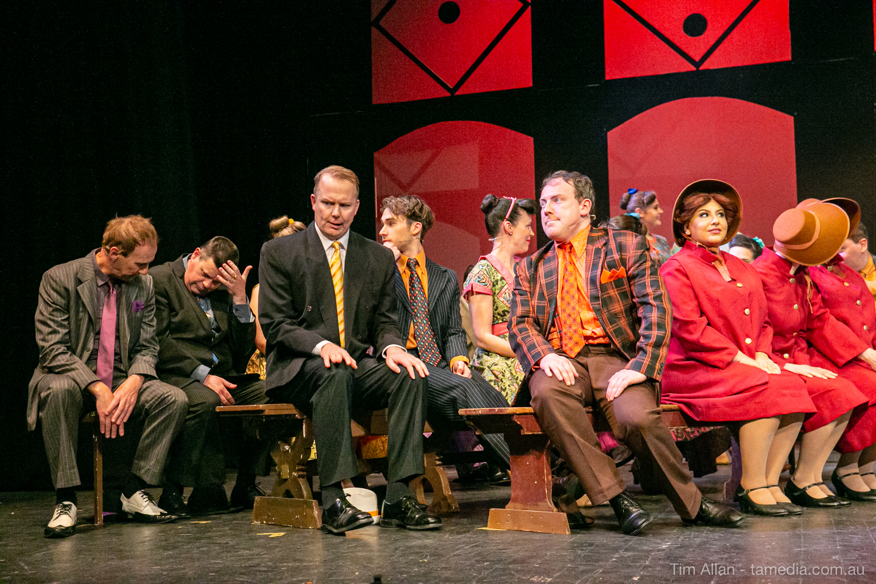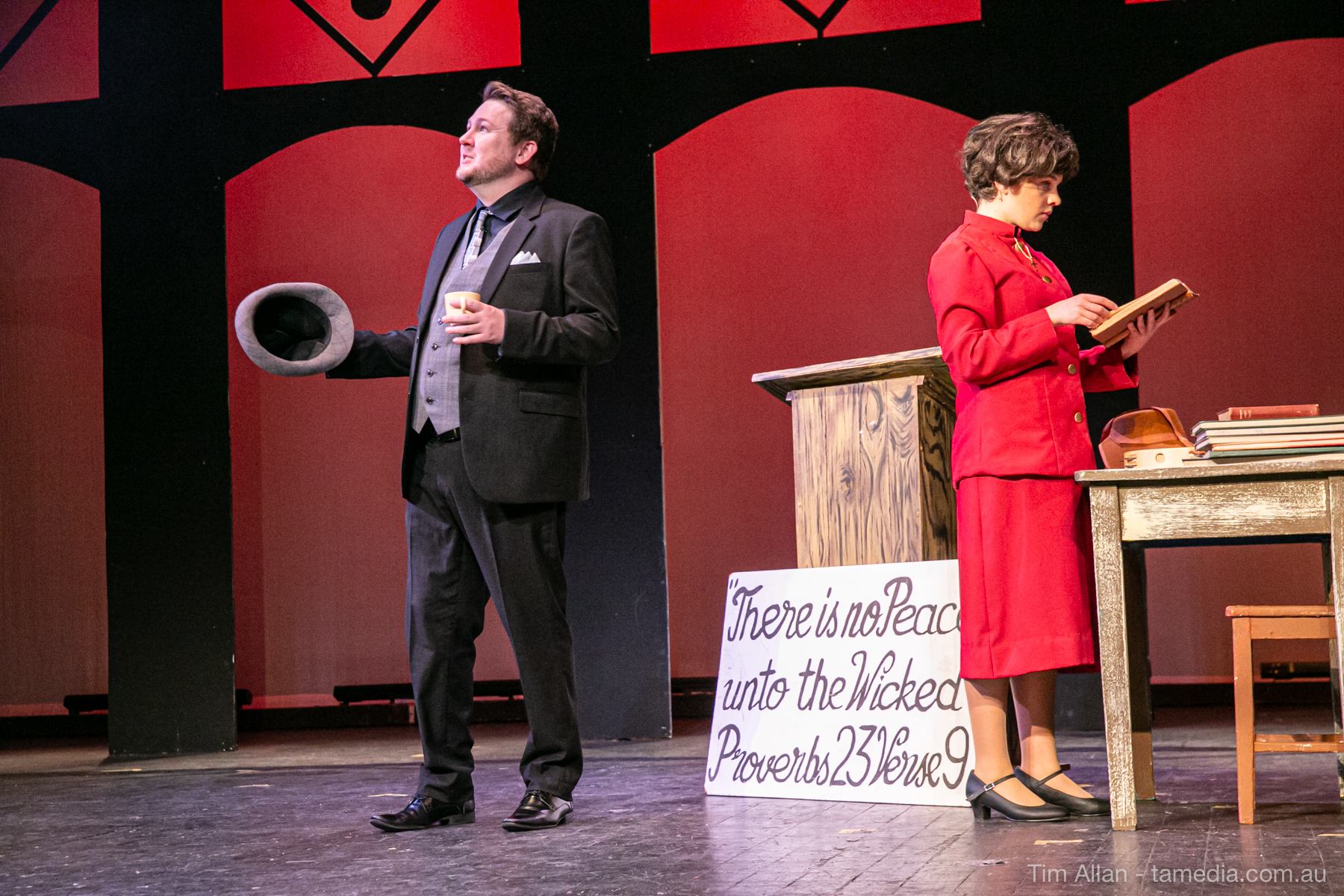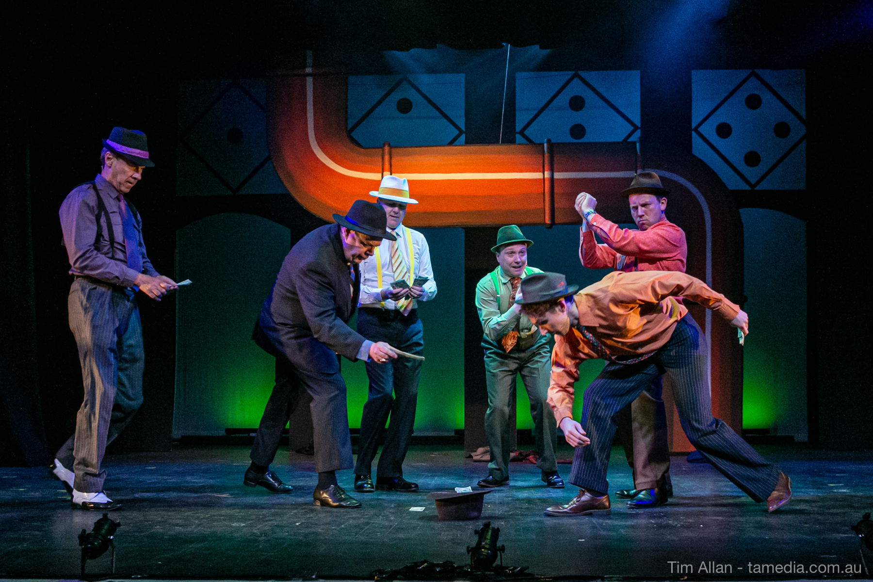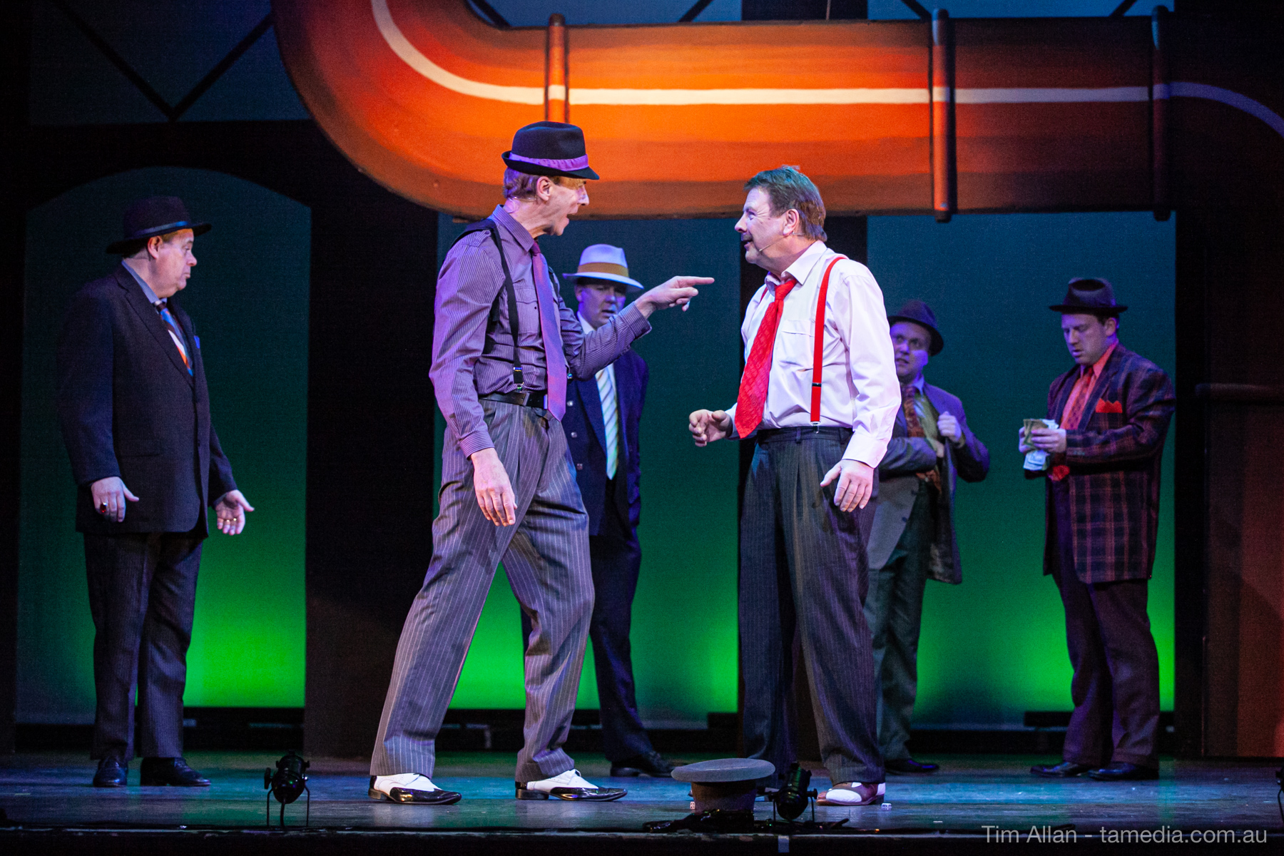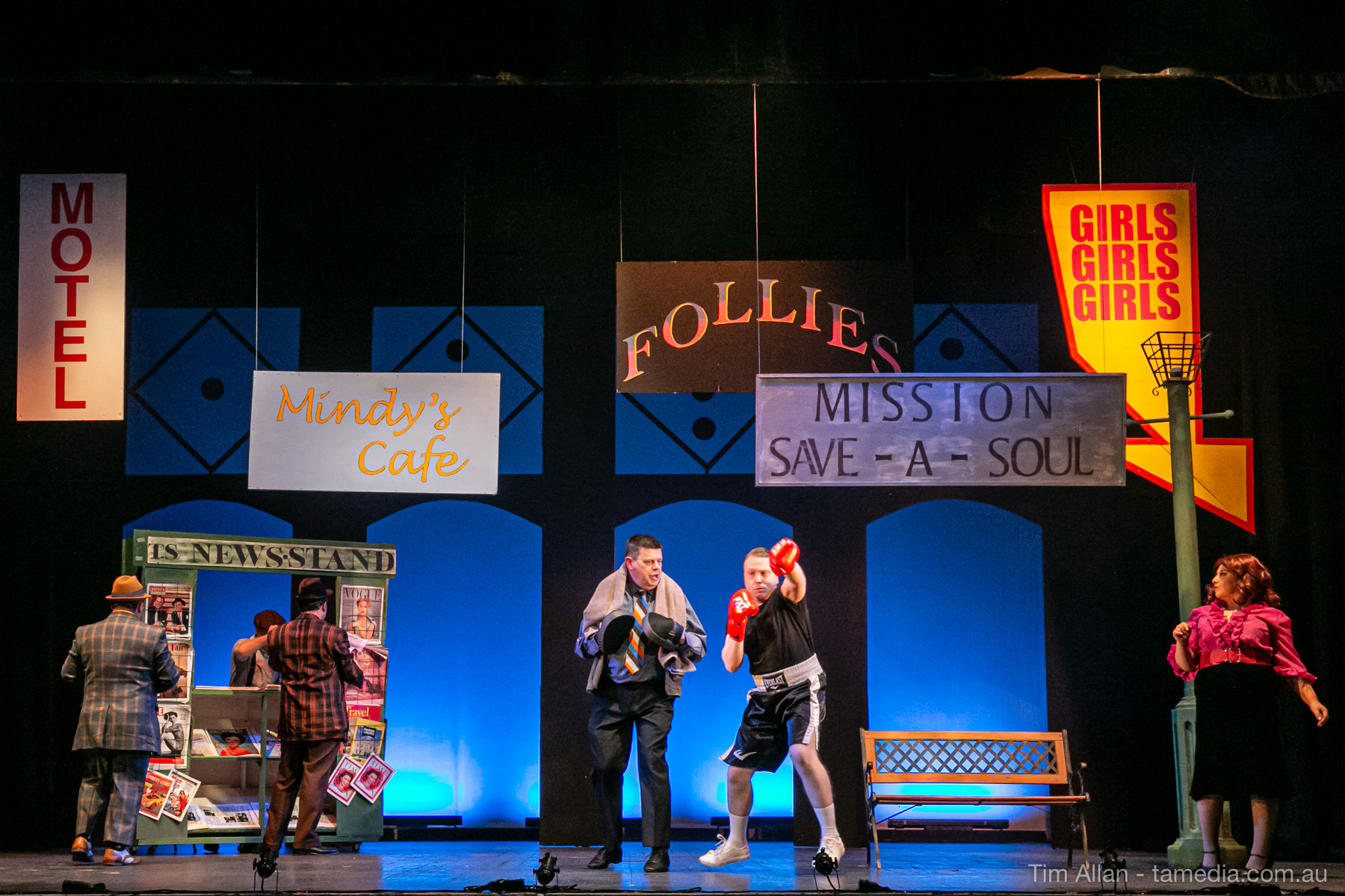 Set in the bustling Manhattan of Damon Runyon’s short stories, Guys and Dolls is a Depression era romantic comedy featuring crap games, horse races, gamblers, show girls and the evangelist members of a downtown Mission. Con-man Nathan Detroit is seeking a new location for his notorious ‘floating’ crap game, but he doesn’t have the dough he needs for a down payment. Enter Sky Masterson, a high-rolling gambler willing to take on any honest bet with a high enough reward attached. Nathan bets Sky that he can’t take the “doll”, of Nathan’s choosing, on a date to Havana, Cuba. When Sky agrees to the bet, Nathan chooses uptight Evangelist Sergeant Sarah Brown, head of Broadway’s Save-a-Soul Mission. Sky thinks he’s been duped, but he’s in for even more of a surprise when his efforts to woo Sarah are so successful that he falls in love with her himself! Meanwhile Nathan is under pressure from his long time ‘fiancee’ and night club dancer, Miss Adelaide, to settle down and get married. What are the odds?
